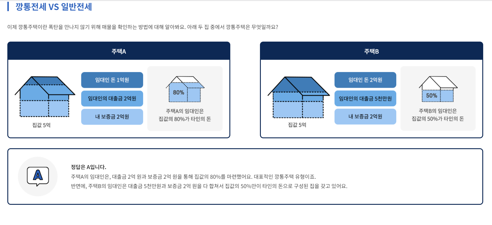 깡톡 주택이란 보증금+대출금의 총합이 집값의 80%를 넘는 집입니다. 즉, 임대인이 자기돈을 얼마를 들여서 집을 마련했는지가 가장 중요합니다. 혹시나 임대인에게 경제적인 불상사가 발생하였을때 빚을 상환 할 수 있는 능력이 없어질 수 있기 때문입니다. 만약 이런 주택에 임차를 할때 경매에 집이 넘어가게 된다면 돈을 돌려 받지 못 할수도 있으며 경매에 넘어가지 않더라도 임대인이 임의로 보증금을 반환하지 않는 일이 발생하여 경제적 불이익과 손해가 발생할 수 있습니다.